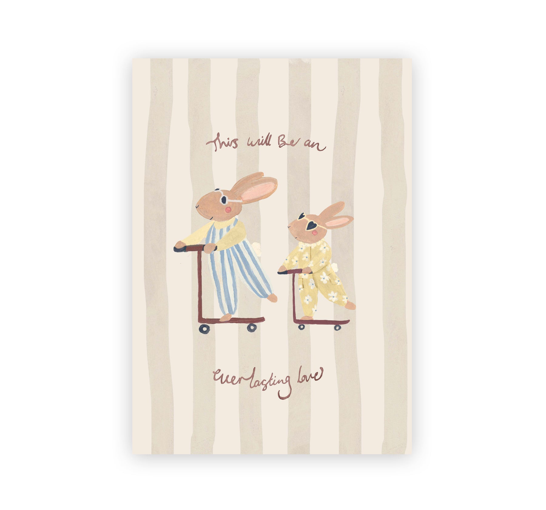 Hand painted rabbit pair riding on their scooters, part of our Sibling Love Series.